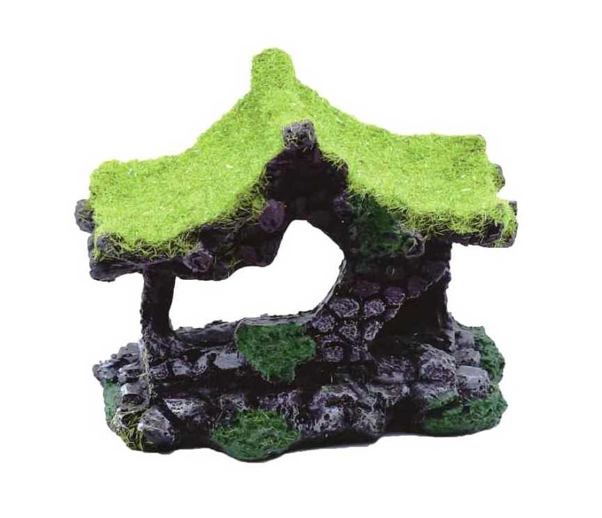 Szép kidolgozású, színes műgyanta mohatetős házikó akvárium dekoráció, műmohával díszítve. Színárnyalata és műmohás díszítése által nagyon jól illeszkedik garnélás akváriumi környezetbe is. Üreges kialakítása búvóhelyet nyújthat a kisebb talajlakó díszhalak, rákfélék, pl. garnélák számára. Akváriumon kívüli díszítésre is alkalmas, pl. terrárium dekor, szobadísz, dioráma stb. Méretei által kisebb vagy közepes méretű akváriumba ideális. Anyaga hőkezelt festett műgyanta. A speciálisan kezelt tartós műgyanta nem mérgező, szagtalan, íztelen, így semmilyen káros hatása nincs az akváriumi élővilágra.