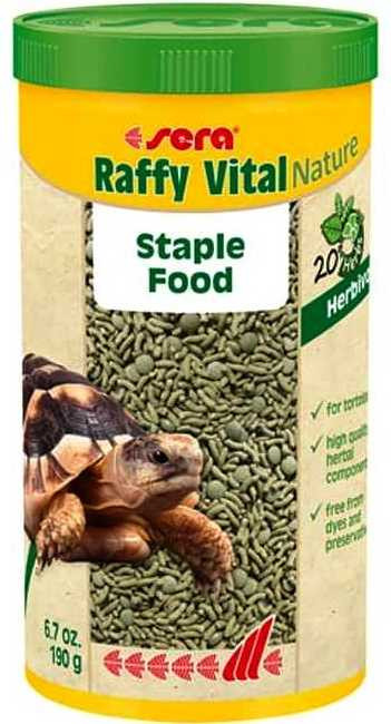 Sera Raffy Vital Nature egy alaptáp színezékek és tartósítószerek nélkül, gondosan előállított rudacskákból és gyógynövénytablettákból, teknősök és minden más növényevő hüllő számára. A különféle gyógynövények, algák és zöldségek keverékét szívesen fogyasztják a legfinnyásabb kisállatok is. Kiegyensúlyozott, természetközeli összetétele rostokban, vitaminokban és ásványi anyagokban gazdag. A benne megfelelően kis mennyiségben található kiváló minőségű fehérjék és Omega zsírsavak optimálisan biztosítják a szükségleteket. Erősíti a betegségekkel szembeni ellenálló képességet, és támogatja az egészséges csontváz és páncélzat fejlődését.